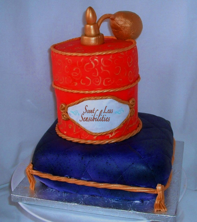 Image: A cake in the shape of a perfume bottle. It was the only one that fit!
