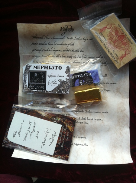 It began at the behest of Monica Skye Miller, the Perfume Pharmer, when she suggested that Katlyn join our devilish endeavor, and I could only agree. I had of course heard of Katlyn’s alchymistical blends, had perused her website, and dreamed, that some day – or some night, I, too, might have a chance to breathe in their wonders. A few emails, some days and the Devilscent Project perfume brief later, I was completely unprepared by what came back in the mail.